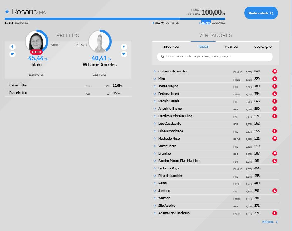 Um detalhe chama a atenção na disputa pela prefeitura rosariense. A vitória da peemedebista Irlahi Linhares [sem tirar os seus méritos] só foi possível por conta de um racha no grupo de oposição. Irlahi foi eleita com 10.568, venceu os adversários de um grupo oposicionista rachado: Willame, que obteve 9.398 dos votos e Filho com 3.167 votos. Se Willame e Filho seguissem unidos, Irlahi amargaria a derrota, já que juntos os dois candidatos de oposição somariam 12.565 votos.